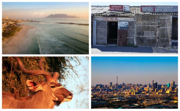 Prente, bo: https://pixabay.com/photos/capetown-beach-sunset-aerial-view-2295679/ en https://pixabay.com/photos/south-africa-township-city-4776071/. Onder: https://pixabay.com/photos/great-kudu-antelope-africa-496561/ en https://pixabay.com/photos/johannesburg-urban-city-scenic-4322256/