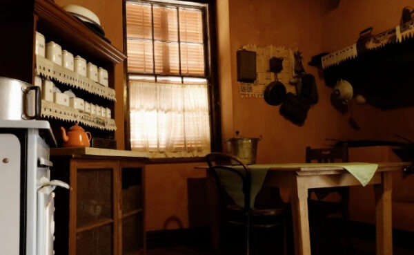 Kyk, die eerste een hier, op jou linkerkant, is die kombuis. A! Die kombuis. Linoleum op die vloer en die stoof daar in die hoek. Daar was altyd ’n kastrol of ’n ketel op die stoof. Vroeër, op Maandae, was daar altyd twee strykysters ook op, want dan is dit strykdag en Mina het al vroeg opgedaag. Later het sy na die buitekamer beweeg en daar die ysters warm gemaak op die Primus.