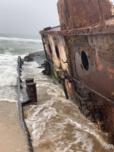 Met die wegspring het ons eers seelangs gestap tot by die Shawnee-skeepswrak. Dis ’n vissersboot wat in 1976 met sy neus die duine in is by Conceptionbaai. Hy lê vandag in die see – die duine van die Namib beweeg en skuif mos. Conceptionbaai was glo voorheen die ingang na klein mynnedersettings in die diamantarea. Die voordeel van kaalvoet wees is dat ek toe lekker in die see kon inloop en deur die patryspoorte foto’s neem van hoe dit binne-in die wrak lyk. Dit was vir my so lekker.