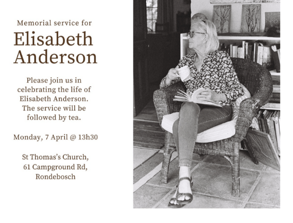 When I learned of Elisabeth Anderson’s passing, I reflected on how profoundly she had shaped not only my career, but the entire landscape of books and reading in South Africa. When I moved to Cape Town in 2000, she became far more than my boss at the Centre for the Book – she was my mentor, champion and friend. Her kindness extended far beyond the workplace: she made a patchwork cot blanket for my daughter, invited my husband and me to house-sit when we first arrived in Cape Town, and welcomed us to spend a week at Kasouga while I was pregnant. When my daughter Kate turned one, Elisabeth encouraged us to celebrate with a staff tea at work. These personal gestures spoke volumes about the warmth and generosity that characterised everything she did.