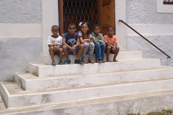 Kinders sit op die stoep van een van die geboue op die werf. Iets wat ons ook kon doen veral as die ou Spoorwegbus kom besoek aflê het.