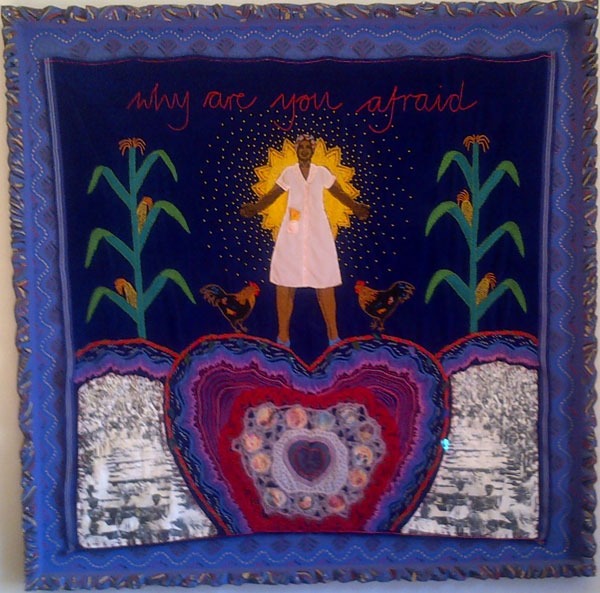 Hierdie kunswerk van Sandra Kriel hang in die portaal van die Rupert Museum op Stellenbosch. Dit is deel van 'n triptiek met die titel: Why are you afraid (1991).