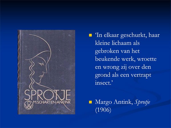 In deze voordracht heb ik gebruik gemaakt van enkele eerdere publicaties: Jacqueline Bel, ‘Sloof of sekssymbool. Over Margo Antinks Sprotje en de sexy dienstmeisjes van Vestdijk’, in: Armada 11 (2005), 41, 30-41; zie ook Jacqueline Bel, Bloed en rozen, Geschiedenis van de Nederlandse literatuur 1900-1945, Amsterdam 2015.