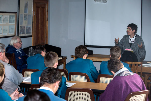 Bibi Slippers en Fanie Olivier was poësiementors – hier werk hulle met ’n groep digters wat die veldskool bygewoon het. (Foto: JK)
