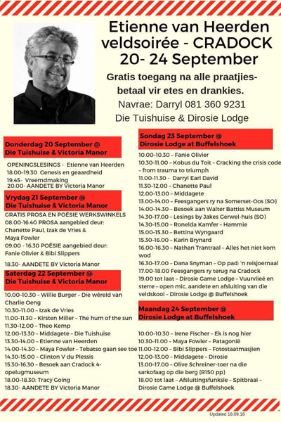 Tydens die pas afgelope Etienne van Heerden Veldsoirée is ’n veldskool vir ontwikkelende skrywers in die Victoria Manor Hotel op Cradock aangebied.