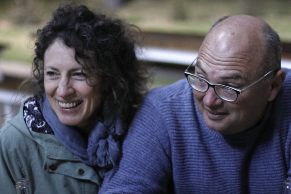 Dirkie Visser, eienaar van Buffelshoek Dirosie Lodge, waar ’n deel van die veldsoirée aangebied is, by Fanie Olivier tydens die “Vuurvlieë en sterre” open mic-geleentheid (Foto: IdV)