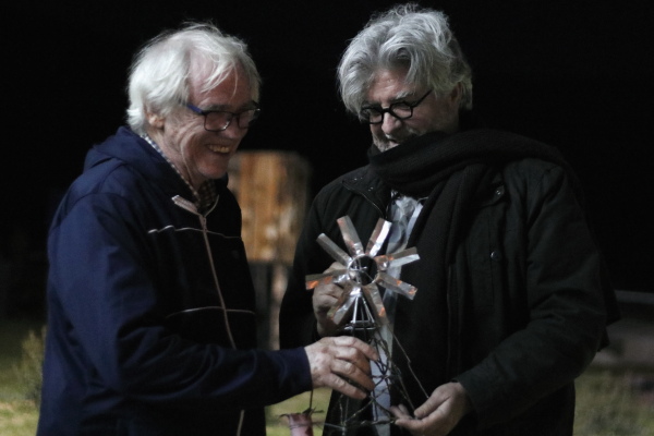 Etienne van Heerden oorhandig die Orde van die Windpomp aan Fanie Olivier. (Foto: IdV)