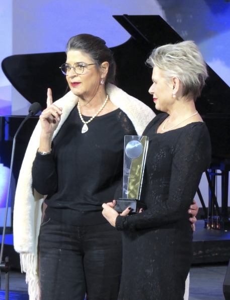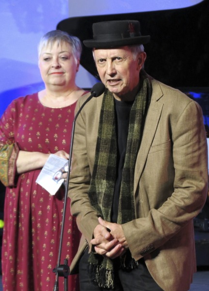 Marina Griebenow, een van die beoordelaars, saam met David Kramer op die verhoog nadat hy die Lewenslange Bydrae-toekenning in ontvangs geneem het (foto: Clifford Roberts)
