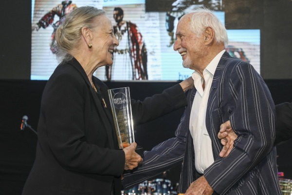 Beverley Brommert, die langsdienende beoordelaar, oorhandig die Lewenslange Bydrae-toekenning aan Peter Cazalet (foto: Clifford Roberts).