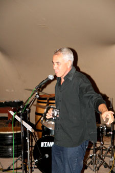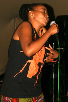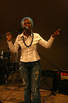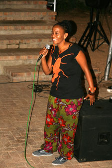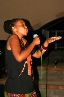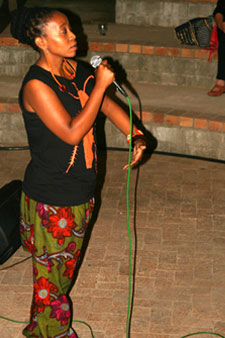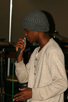 | Een van die lede van die Kayamandi Readers and Writers Group, Bongo Flepu, dra sy rap-gedig voor. | |