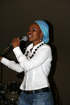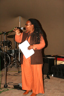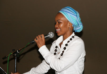 | Hale Tsehlana van die Universiteit Stellenbosch stel vir Primrose Mrwebi bekend. | Primrose Mrwebi het tydens haar optrede gedemonstreer presies hoe die gesproke woord die gehoor kan meevoer. |