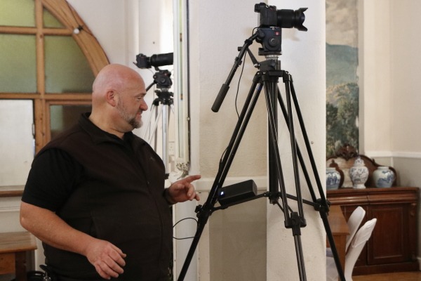 Intussen is die saal en die toerusting gereed gemaak vir die groot afskop. Hier is Pieter Fourie besig om die videokameras gereed te maak.