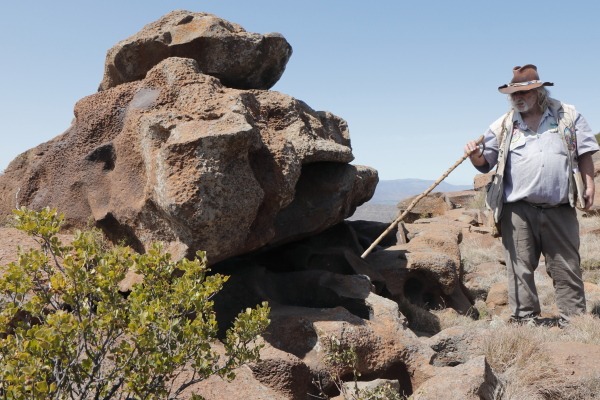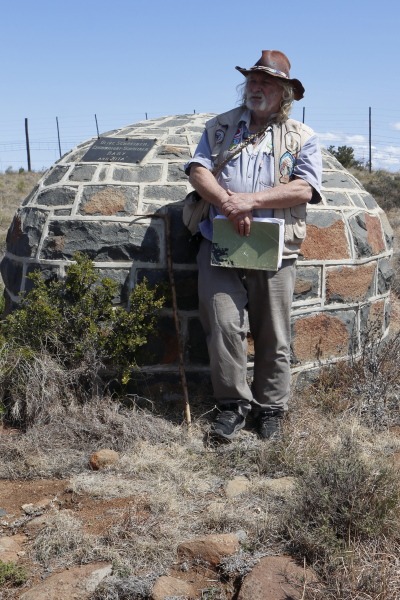 Hier is Mills by die sarkofaag waarin Olive Schreiner, haar man Cronwright, hul baba en hulle hond begrawe is. Die sarkofaag is meer as 100 jaar oud en het tekens van verweer begin toon, maar Mills het dit gerestoureer.