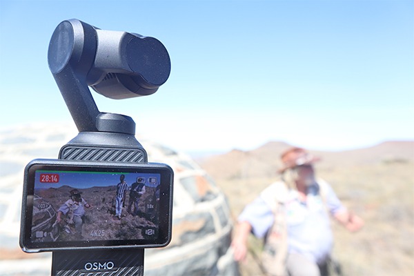 Die videograaf Pieter Fourie neem vir Basil Mills op, terwyl hy vir feesgangers meer oor Olive Schreiner se sarkofaag op Buffelskop vertel.