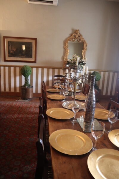 ’n Tafel in die eetkamer langs die rooi eetkamer in Victoria Manor. Feesgangers het baie smaaklike Karoo-etes hier geniet!