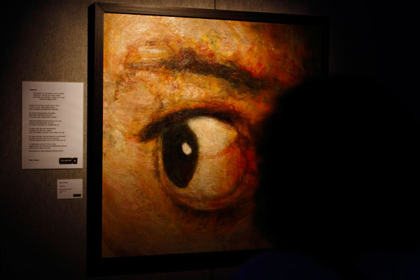Hier is Pauline Gutter se skildery Ooggetuie met Tom Gouws se gedig “roepman” – saam met ’n toeskouer (regs onder). Nita Cronjé was die kurator van Skilder met woorde III. |