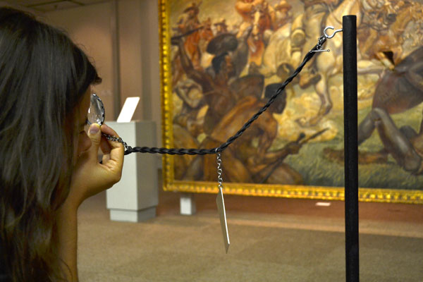 | 'n Besoeker kyk deur 'n vergrootglas 'n skildery. | ||