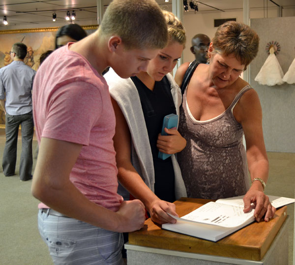 | Feesgangers blaai deur die Sasol Kunsmuseum se besoekersboek. | ||