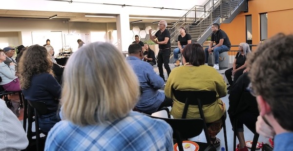Die Cape Flats Players onder leiding van Peter Braaf doen ’n dramatiese voordrag van gedigte van Adam Small, Peter Snyders en Patrick Petersen.