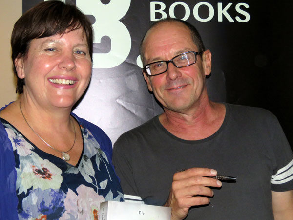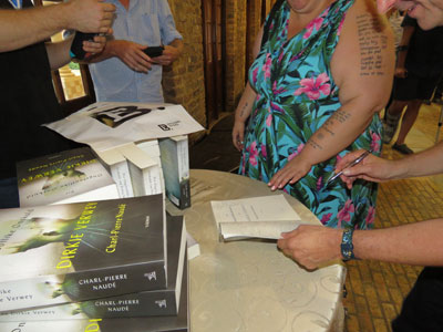 Charl-Pierre Naudé onderteken 'n boek.