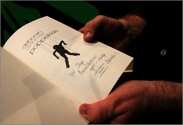 Deborah luister terwyl Thys Human uit haar boek voorlees. Hy het ook opgemerk: "Poppekas is gewis een van die interessantste en onvoorspelbaarste novelles wat ek die afgelope tyd (in Afrikaans) gelees het."