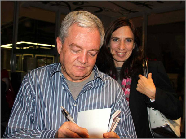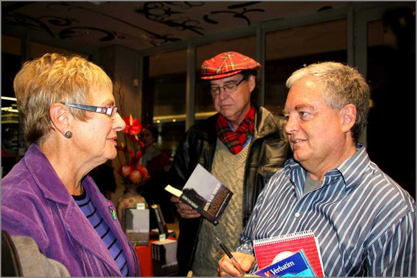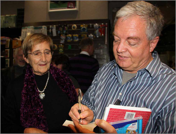 Leon gesels met Carol van der Merwe nadat hy haar boek geteken het.