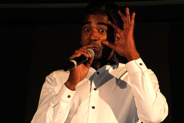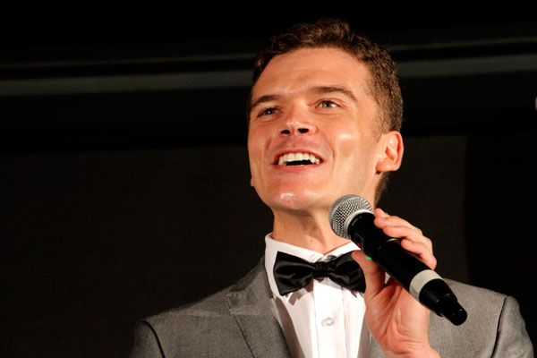 Elwin September ontvang sy trofee as US Woordfees 2015 se Feesheld van Saartjie Botha.