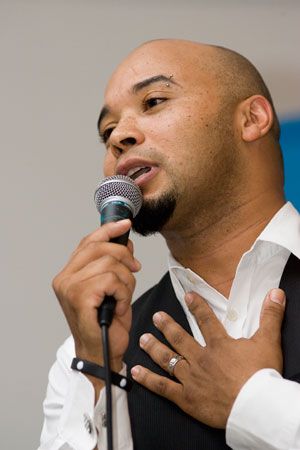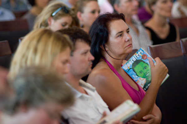 Studente en Woordfees-assistente by die US Woordfeesprogrambekendstelling. |