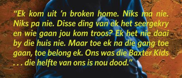 Ek lees die storie van een van die mense in jou boek. My hart breek vir die outjie wat op agtjarige ouderdom verkrag is. Jou boek handel nie eintlik net oor gangsters nie. Dit handel oor die kinders wat gangsters word. Hoe kry mens die kinders uit die strate, hoe kry mens hulle in beskermde omgewings waar daar vir hulle geleenthede is? Hoe kry mens hulle om oor hul trauma te praat dat daar iets gedoen kan word voordat dit te laat is? Dalk kan jy nie al die oplossings gee nie! Maar het jy tydens jou navorsing vasgestel wie kan help en is daar noodnommers of adresse wat kinders kan besoek wat in sulke omstandighede vasgevang is?