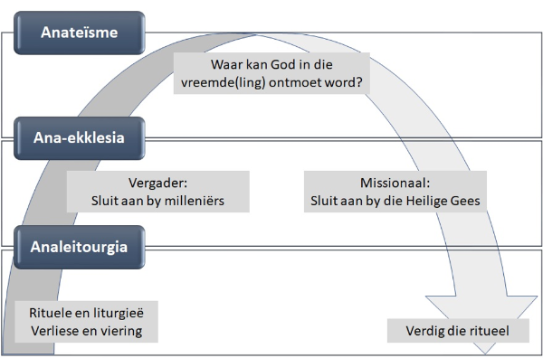 Die begrippe en terme anateïsme, ana-ekklesia en analeitourgia word gebruik om nuut te dink oor die wyse waarop God ontmoet word, waarop daar met mekaar vergader word en hoe God in die alledaagse beleef word. Rituele word as begin- en eindpunt in die herbesinning van aanbidding saam met kerklos millenniër-Christene voorgestel. Dit is met behulp van rituele dat die kerk kan beweeg na ’n alternatiewe, gegronde geloofsgemeenskap wat God in die alledaagse en in die vreemde(ling) ontmoet.