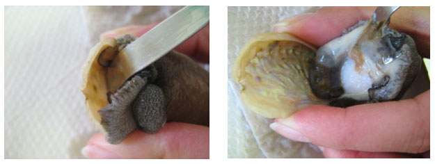 Twee groepe van tien perlemoene elk is onderskeidelik op 9 Maart en 4 Mei 2010 vanaf die Abagold-perlemoenplaas versamel. Die SVK van elke perlemoen is asepties verwyder. Elke SVK is in ’n aparte steriele houertjie met 10 ml steriele fisiologiese soutoplossing (0,9% NaCl) en suurgewaste glasballetjies (Sigma, Suid-Afrika) geplaas. Voordat die SVK’s in die steriele houertjies geplaas is, is die fekale inhoud van elke kanaal versigtig verwyder (Figuur 3a-e).