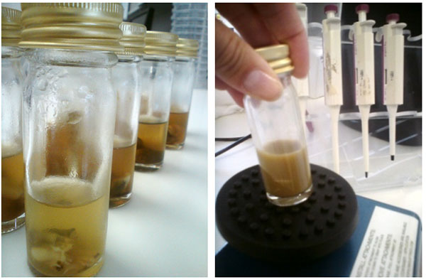 Elke SVK is fyn gemaal deur dit vir 5–7 minute op ’n Vortex-2 Genie te meng (Figuur 3f). ’n Verdunningsreeks van 10–4–10–7 is van elke SVK-monster voorberei. Die verdunnings, saam met een onverdunde monster van elke SVK, is op drie verskillende mikrobiese groeimedia wat voorberei is met gefiltreerde seewater, uitgeplaat. Die media wat gebruik is, sluit Triptoon Soja agar (TSA), De Man, Rogosa en Sharpe agar (MRS) en Zobell agar in. Nadat al die monsters uitgeplaat is, is die plate vir 3–7 dae by 20°C geïnkubeer. Verskillende bakteriekolonies is ewekansig vanaf die plate gekies en uitgestreep sodat reinkulture verkry kon word. Die reinkulture is in 100 nM CaCl2 en 15% gliserol by –80°C gestoor.