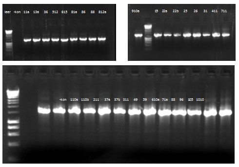Figuur 4. 1,5% agarose-gel-foto van 16S rRNA PKR-produkte van bakteriële isolate wat geselekteer is op grond van Gramkleuring, katalase- en oksidasetoetse. ’n HyperLadder I (Bioline) leer is gebruik en die gemiddelde grootte van die bande wat verkry is, is 1 200bp