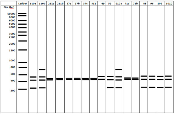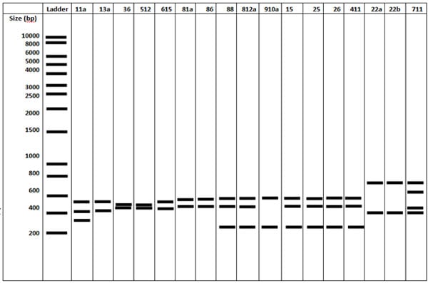 Figuur 5. a. Agarose gel foto van die geamplifiseerde 16S ribosomale DNA wat gesny is met RasI. b. Restriksie-fragment-lengte-profiele wat saamgestel is vanaf agarose gel foto in figuur 3 a. Verskillende bandpatrone dui op moontlike verskillende spesies. ’n HyperLadder I (Bioline) leer is gebruik om die relatiewe groottes van die bande te bepaal.