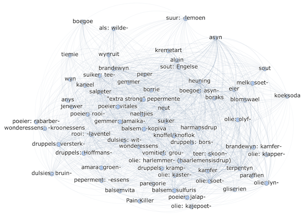 Figuur 1 dui die k-kern van die bestanddeel-bestanddeel-kovoorkomsnetwerk vir alle boererate aan, met 68 nodusse (n) en 1 517 skakels (m). Hier kan gesien word dat wildeals, asyn, brandewyn, heuning, eier, koeksoda, tiemie, boegoe, Engelse sout, balsemkopiva, suurlemoen, blomswael, kasterolie, soetolie en lynolie almal tot die k-kern van die netwerk behoort. Hierdie is dan die belangrikste bestanddele (middels en plante) in hierdie boererate oor die algemeen.