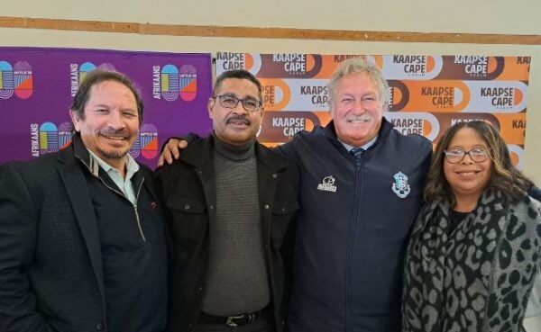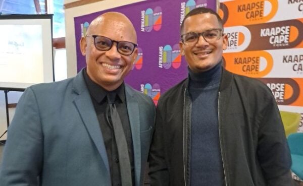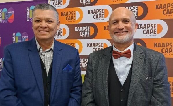 Foto 1: Theuns Eloff, Trust vir Afrikaanse Onderwys, ook oudrektor en dosent, Marlene le Roux, uitvoerende hoof van Kunstekaap, en Neil Jacobs.; foto 2: Heindrich Wyngaard, voorsitter van Kaapse Forum, en Marco Pitcher. (Foto’s: Maryke Roberts)