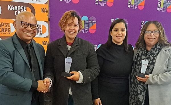 Twee “Kaapse kampioene” is tydens die beraad aangewys. Dis mense wat spesiaal moeite doen om ’n verskil in hul gemeenskappe te maak. Van links is Heindrich Wyngaard, Chane Arendse van Arend se Nessie Dagsorg op Bredasdorp wat as onderwyser kwalifiseer het en haar eie dagsorg geopen het, Elizma Arendse van Kaapse Forum. en Benorita Ockhuis van Villiersdorp Sekondêr – dié skool het etlike maande gelede afgebrand en deur haar leierskap vlieg hulle weer.