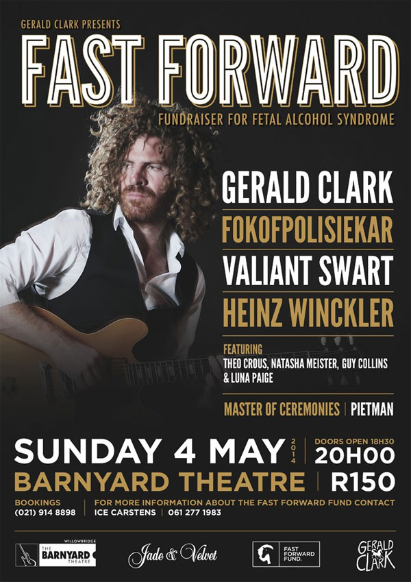 The Gerald Clark, in collaboration with Fokofpolisiekar, Valiant Swart, Heinz Winckler, Theo Crous, Luna Paige, Natasha Meister and Guy Collins, is raising funds for children with fetal alcohol syndrome on Sunday 4th May at the Barnyard Theatre in Willowbridge. Gerald and friends have decided to pitch in and host an all-star fundraiser concert for this worthy cause.