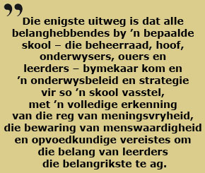 Die enigste uitweg is dat alle belanghebbendes by ’n bepaalde skool – die beheerraad, hoof, onderwysers, ouers en leerders – bymekaar kom en ’n onderwysbeleid en strategie vir so ’n skool vasstel, met ’n volledige erkenning van die reg van meningsvryheid, die bewaring van menswaardigheid en opvoedkundige vereistes om die belang van leerders die belangrikste te ag. So ’n proses van beraadslaging sal sekerlik nie oornag kan plaasvind nie en sal behoorlik administreer moet word om ideologiese wanbeelde en vooroordele te oorkom en wedersydse aanvaarding van verskille te bewerkstellig.