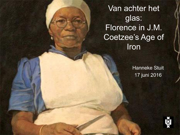 Ik wil het vanmiddag graag met u hebben over een personage en een boek waarvan ik weet dat het Ena na aan het hart ligt en dat is Florence uit de roman Age of Iron van JM Coetzee. Mijn beginpunt van mijn analyse ligt eigenlijk bij het omslag van Ena’s magnum opus en zet zich voort in Ena’s analyse van Florence in Soos familie. Hier achter mij heb ik de afbeelding die ook op het omslag van Soos familie staat opgenomen, niet omdat deze vrouw Florence is, maar omdat haar blik, en vooral haar bril me deed denken aan Coetzees meedogenloze karakterisering van Florence in Age of Iron.