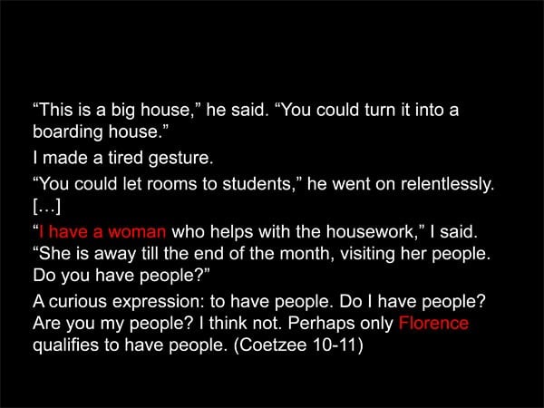 Hier zien we al heel vroeg de complexe relaties tussen Mrs Curren, haar dochter, hier aangesproken als you, Vercueil en Florence. Een wirwar aan associaties, een gebrek aan communicatie, een kluwen van aannames over de Ander. Het feit dat Florence zijdelings naar voren komt is hierbij, om het zacht uit te drukken, misleidend. De opmerking dat alleen Florence aanspraak kan maken op het hebben van mensen, op het thuishoren in een gemeenschap, legt de open zenuw van dit indrukwekkende werk bloot: een band met Florence is het enige dat Mrs Curren in haar eigen ogen aanspraak kan geven op een houdbare positie in de samenleving. Zoals Ena schrijft, zijn de lotgevallen omtrent Florence en haar kinderen de werkelijke dragers van de roman (360). Zonder Florence mist zij cruciale informatie over wat er een aantal kilometer van haar huis en in eigen land gebeurt, zonder Florence vervalt het huis, zonder Florence is er geen politiek of ethiek waar Mrs Curren zich toe kan verhouden. Maar zoals, Mrs. Curren zelf ook zegt: “What I want from Florence I cannot have” (41).
