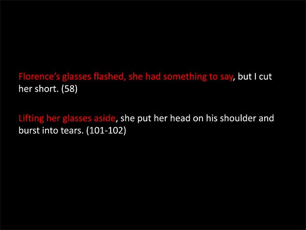 Een bril is niet per se een barrière, dat hangt volledig af van de manier waarop het licht erop valt. De bril weerspiegelt op het moment dat de twee vrouwen ver van elkaar verwijderd zijn (Coetzee 58), gaat af als Florence kwetsbaar is (101-102), en is transparant als Mrs. Curren zich bewust is van haar verlangen tot erkenning richting Florence (141-142). De bril van Florence staat voor dit verlangen, voor de mogelijkheid en onmogelijkheid om haar in de ogen te kijken. In Age of Iron kijkt Mrs. Curren van achter het glas naar Florence in de hoop haar blik te vangen. Achter het glas verschanst Florence zich, en neemt Mrs Curren in zich op, met een vlijmscherpe blik.