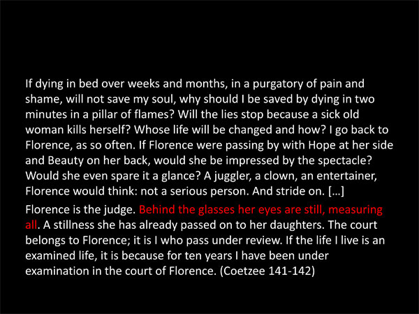 Dit is geniaal gedaan door Coetzee. Door de opbouw van het motief van de bril weten we bijvoorbeeld al dat Florence kapot gaat van binnen voordat we zien dat zij huilt (101-102); zij zet immers haar schild af. Maar de climax van de rol van de bril komt volledig tot haar recht in de volgende passage, waarin Mrs Curren duidelijk maakt waarom zij doet wat zij doet. Waarom zij geen medicatie wil, waarom zij haar dochter niet belt, waarom zij op de zwerver Vercueil rekent om de brief aan haar dochter te posten als ze zelf is overleden. De dochter is niet het beoogde publiek, ondanks het feit dat de brief aan haar geschreven wordt. Het gaat om Florence en we zien hier, zoals Ena ook zo scherp en eigenlijk als eerste opmerkt in Soos familie, dat niet Vercueil, niet de dochter, maar Florence de spil is in het leven van Mrs Curren. Dit is de passage waarin Mrs Curren zich afvraagt hoe haar dood betekenis kan krijgen: