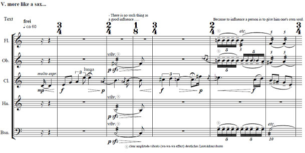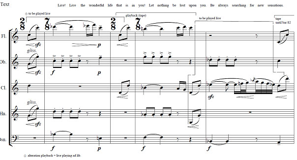 In this work, five different texts from five different realms and times, spoken in five different languages by five different persons, obviously all of different ages and characters, are allegorically associated with the five different instruments of the quintet. Each movement represents a certain historical period, by referring to a typical literary theme of philosophy. At the same time each especially features the instrument that originated during that epoch, or which played a distinct role at the time. Each of the five movements combines music and text, which is played back from tape. Needless to say, this is done in five different ways.
