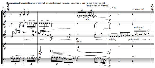 Volgens Kramer (1990:10) se uitgangspunt rondom die simbolies-strukturele belang van ’n stylfiguur word daar in die konteks van Little Portrait geredeneer dat die laaste deel van die werk, ten spyte van die betreklik hoë vlak van musikale abstraksie, simbolies gelaai is. Dit is ook in hierdie deel dat die werk se onderliggende pessimistiese narratief ’n hoogtepunt bereik. Terwyl elk van die vyf dele ’n eiesoortige boodskap van morele verval dra, is dit in die laaste deel dat dit die duidelikste blyk dat die prys vir die menslike neiging om begeerte bó deug te kies, tot verdelging lei. Hiervoor is Huyssen (1993:34–5) se uittreksels uit Dorian Gray by uitstek geskik, aangesien die onopgeloste konflik waardeur die boek se verhaal gekenmerk word, op diepe, selfvernietigende “skeuring” dui.