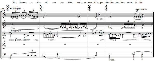 In the last movement the music is nothing more than a moody background, the text being linked to it solely on an emotional level. This is blatantly revealed after the slow intro, when an actor (or actress) bursts onto the stage and takes over the recital of the text, while the music now comes from the tape – a lax and easy-going background track [...].