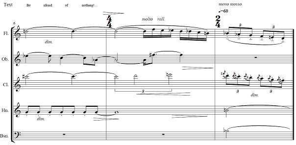 Soos voorheen opgemerk, trag die komponis geensins om die allegoriese inhoud van die werk op enige direkte wyse klankmatig te “vertaal” nie. Ongeag die instrument wat in ’n bepaalde deel figureer, en ongeag die simboliese betekenis onderliggend aan die onderskeie tekste, plaas Huyssen elke beweging binne die estetiese kader van ’n spaarsame modernistiese idioom, hoewel die musiek nooit aan atmosfeer ontbreek nie. Die indruk ontstaan gevolglik dat die musiek enige van die woordtekste sou kon huisves, en dat dit doelbewus nie in noue koppeling met die uiteindelike tekskeuses gekonseptualiseer is nie. Die tekstuur van die musiek is deurgaans hoogs kontrapuntaal, dog dit neig tot ’n eensoortige soort soniese landskap wat dwarsdeur die werk volgehou word en slegs in die laaste deel vryer ontwikkel word waar ’n sterker verband tussen woord en toon gevestig word. As uitnemende voorbeeld van dié skryfstyl word die eerste gedeelte van deel V (“More like a sax”) hier onder as voorbeeld verskaf (die partituur is transponerend geskryf, en die klarinet in B is voorgeskryf):