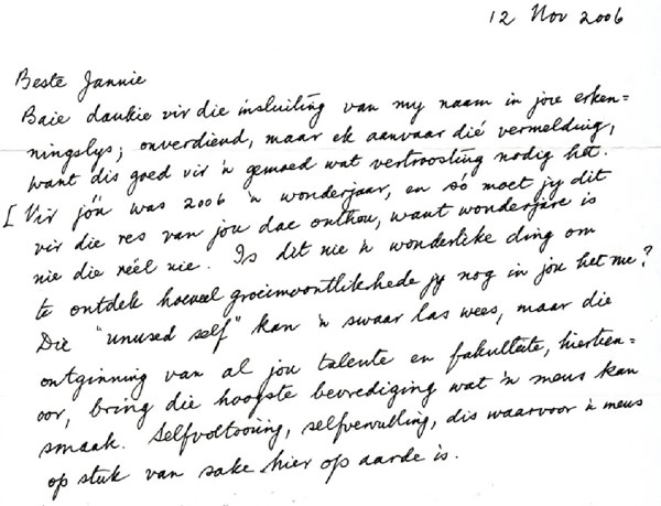 Jou woorde en insigte is ingeweef in my menswees en rig en verkwik my – help dat ek die lewe self kan verduur en geniet. Onlangs nog het jy my op nuwe paaie gestuur in my akademiese skrywery: jou opmerking dat akademici wat vir akademici skryf, op inteling neerkom, het my laat besluit om terug te keer na my eerste liefde: die biografie. Ek het ’n kollega se lewe en klasse as onderwerp vir ’n waarderende artikel geneem, en ingestuur LitNet Akademies toe. Nog ’n biografiese artikel broei reeds ná ’n werkswinkel vir onderwysers, waartydens ons na ’n DVD van Cliff Richard gekyk het om te bepaal wat ons by hom kan leer […].