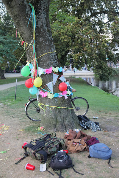 Wie sit daar teen die skemer? Dis Joost van den Vondel in sy park. ’n 17de-eeuse skrywer tussen rooi kannas. Niks skeel hom nie. Regs van hom rook ’n groep gelukkige mense zol. Eybers fluister in my oor waar ek soos ’n kleuter in Vondelpark bly staan: grondelose verwondering. Fietse flits verby, feitlik geruisloos. Jy sal sweer hier val niemand ooit van ’n speek af nie.