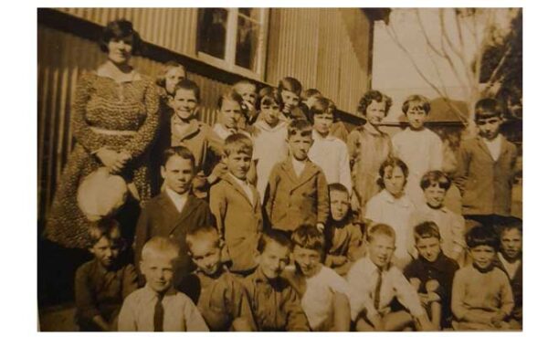 Onderwyseres en leerlinge aan die Solitaire-plaasskool gedurende die dertigerjare. (Bron: Familielid se privaatversameling)